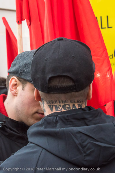 'Working Class VEGAN' tattoo on the back of a man's neck