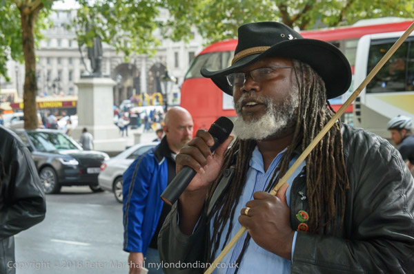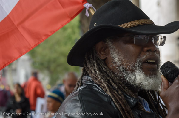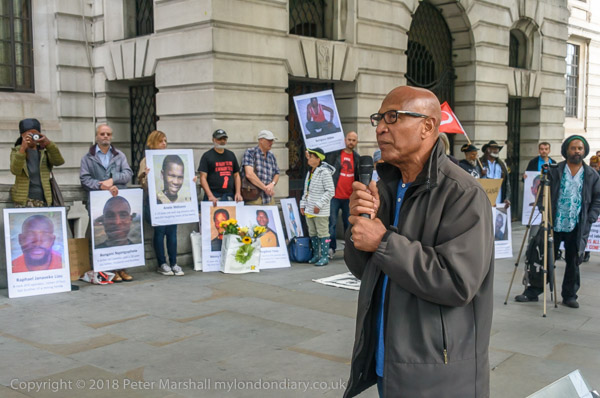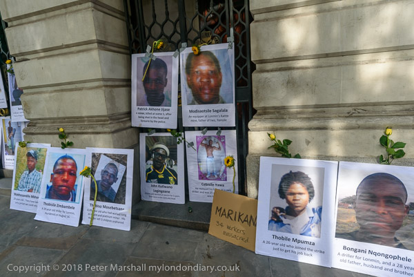 People read the name of one of the murdered strikers then take flower to lay in his memory Flowers and portriats of the murdered miners on the locked gates of South Africa House0 The protest ends