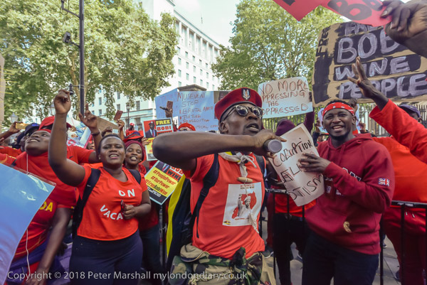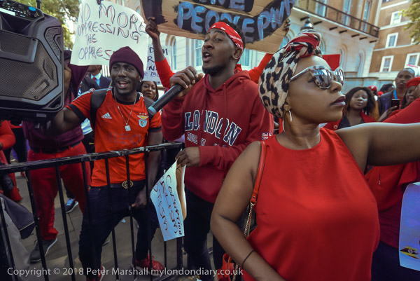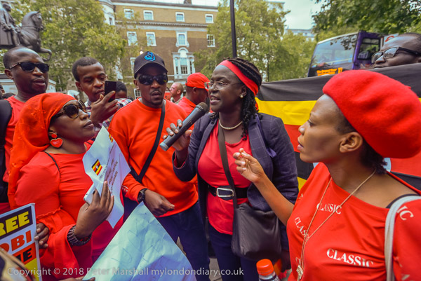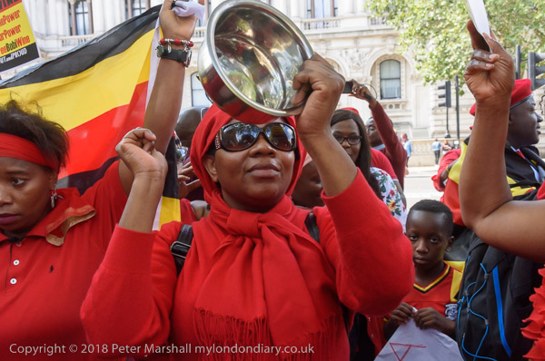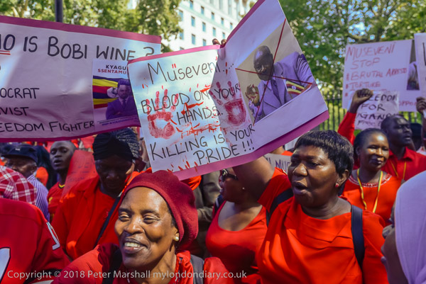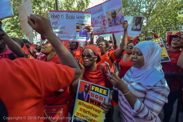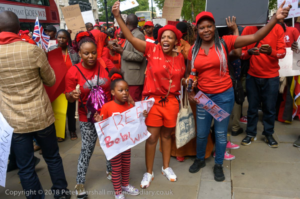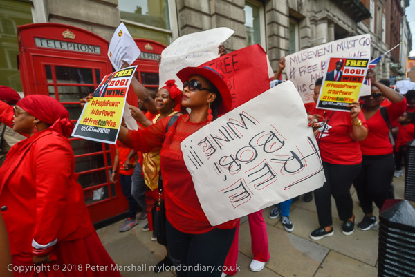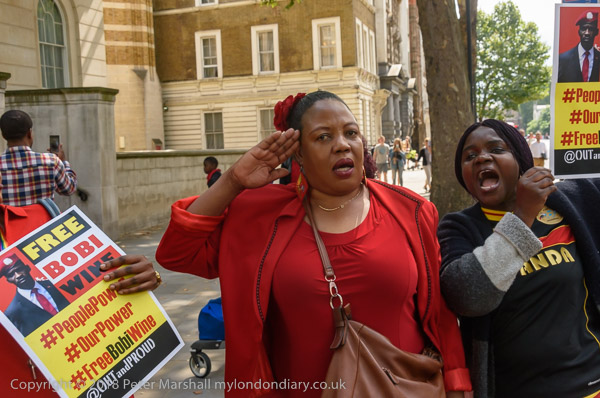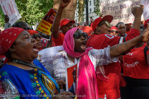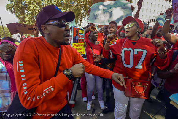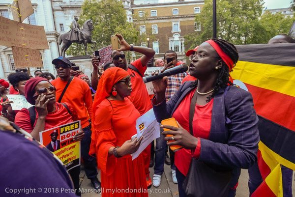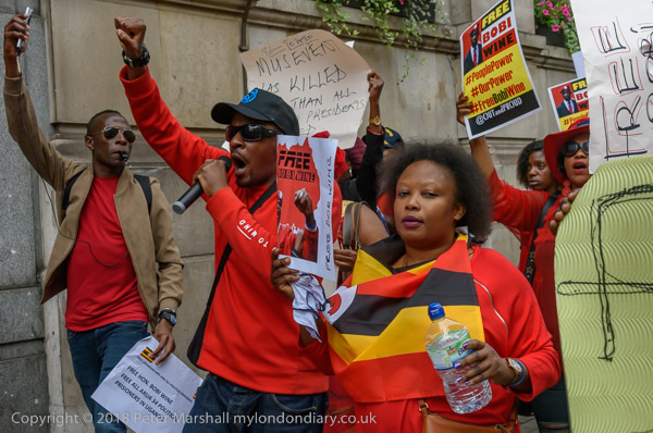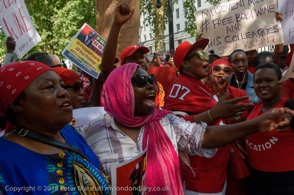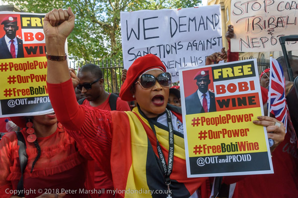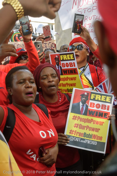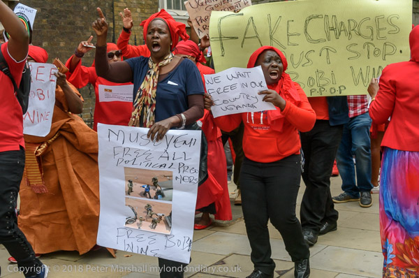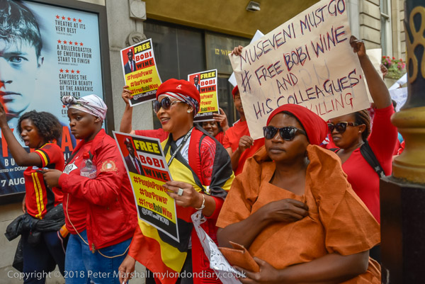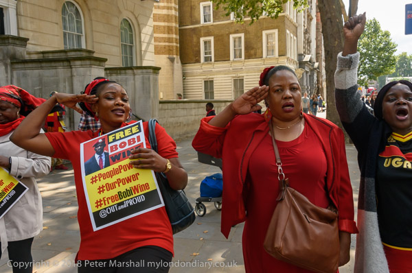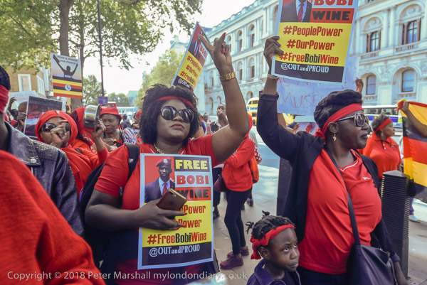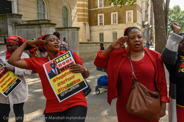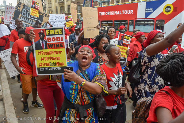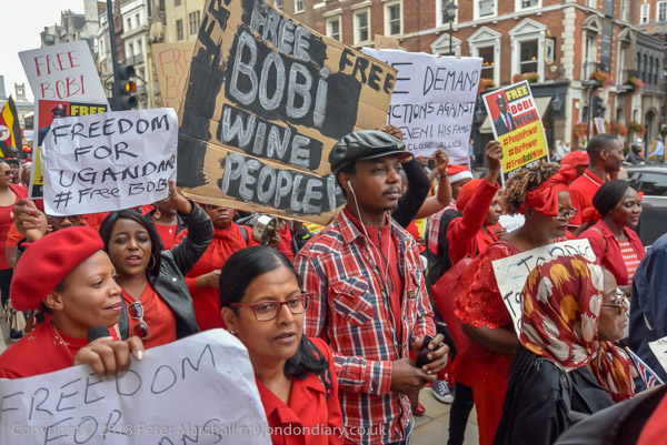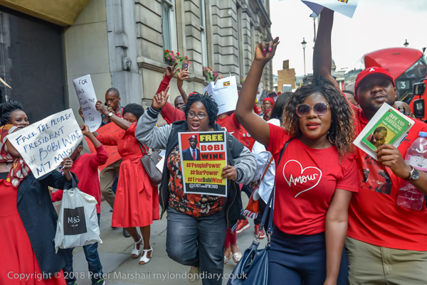 Protesters march down Whitehall shouting for the release of Bobi Wine