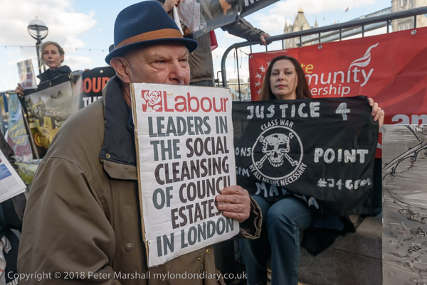 and holds up the poster 'Labour Leaders in the Social Cleansing of