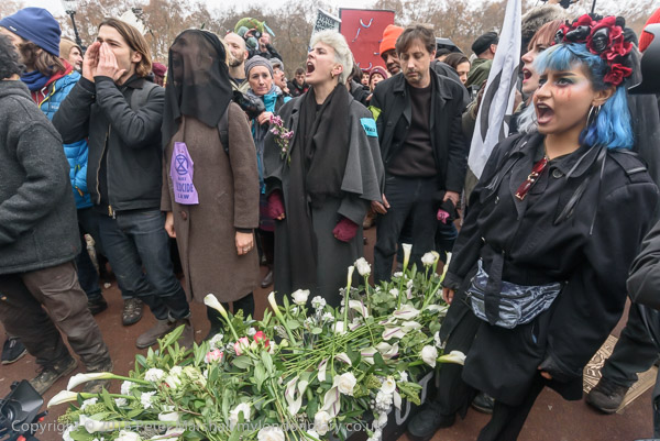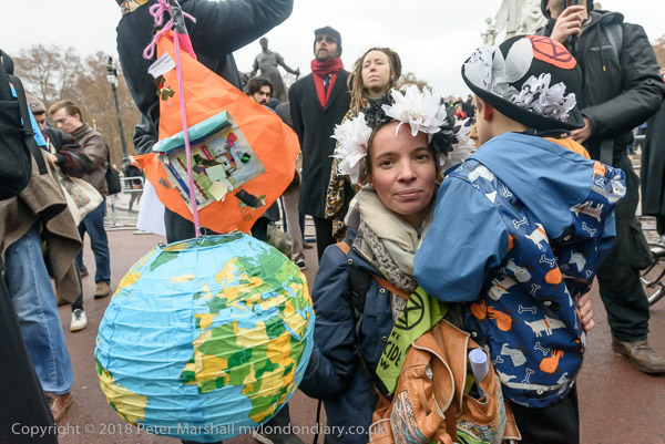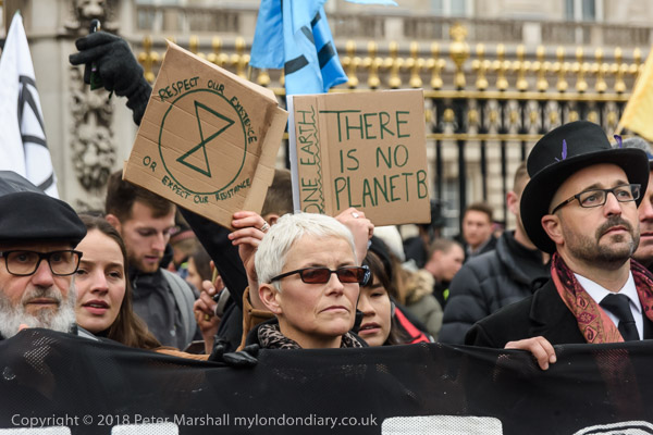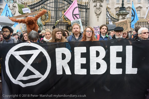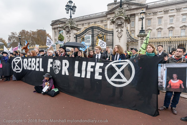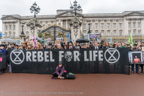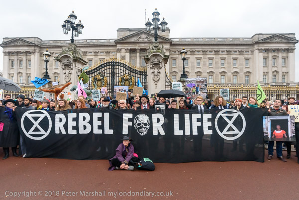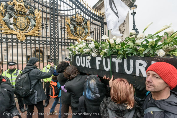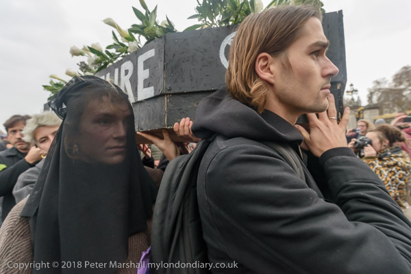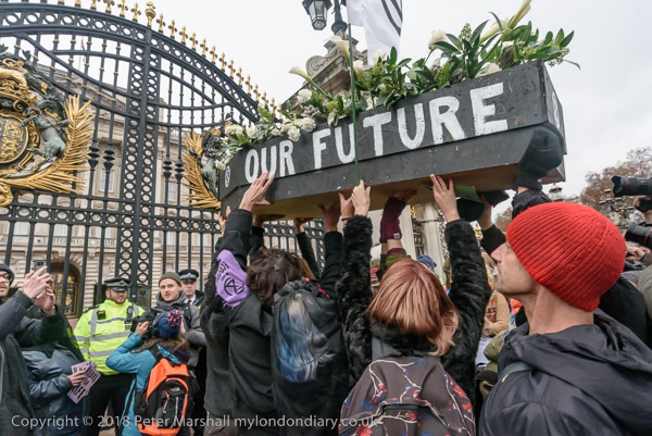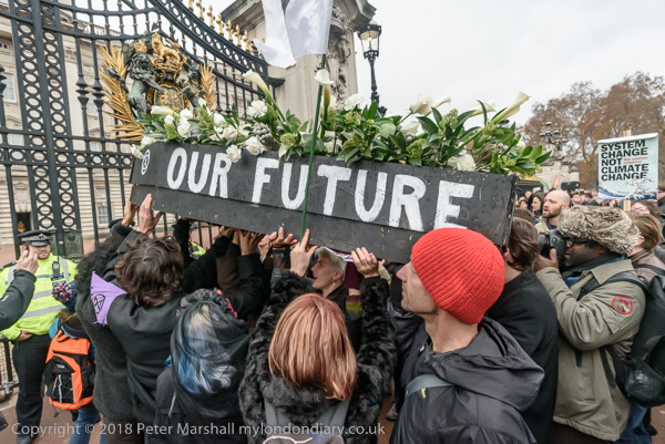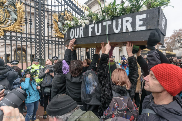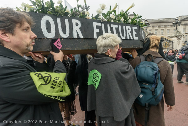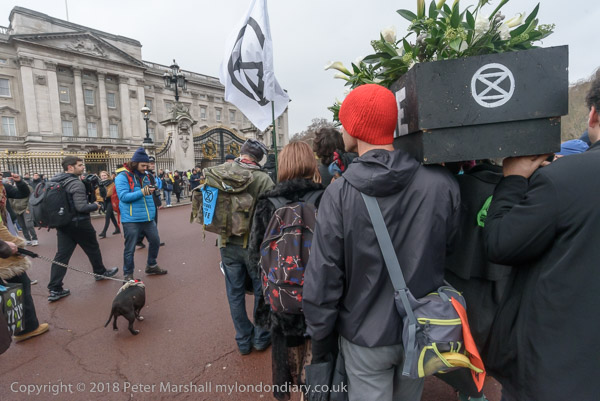 The pall-bearers approach Buckingham Palace with the Extinction Rebellion