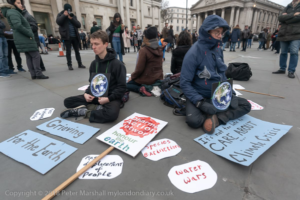 Protesters from the Dharma Action Network meditated in Trafalgar Square and handed out flyers calling for people and governments to take effective actions to combat climate change.