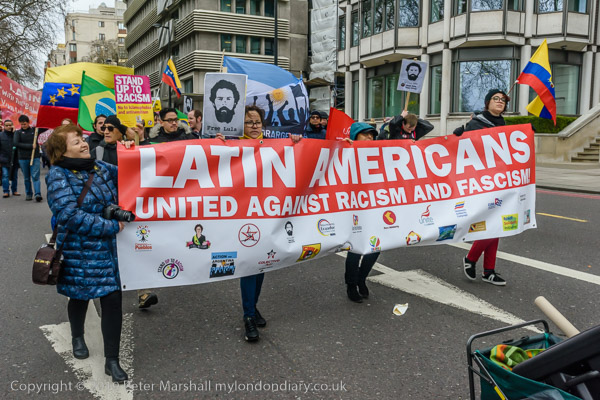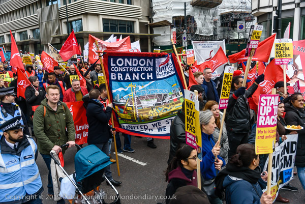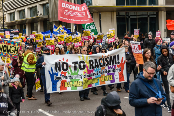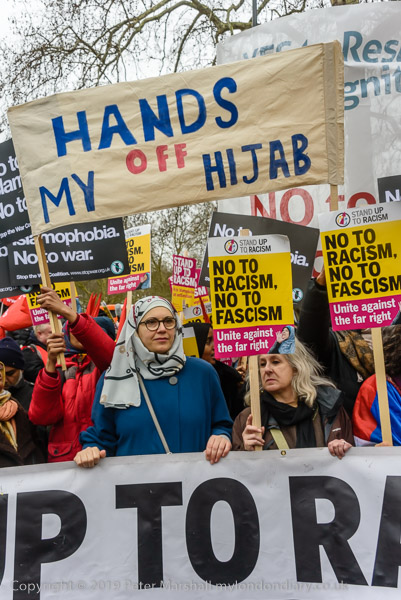 'No to Racism, No to Fascism' and a banner, 'Hands Off My Hijab' at