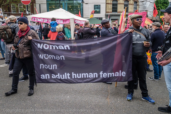 A pair of anti-Trans protesters hold a banner
