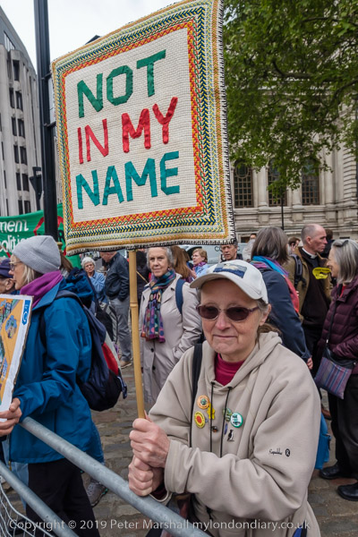 'Not in My Name' and on the other side 'No To War' on a hand-embroidered