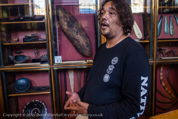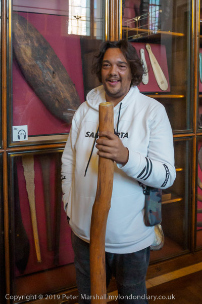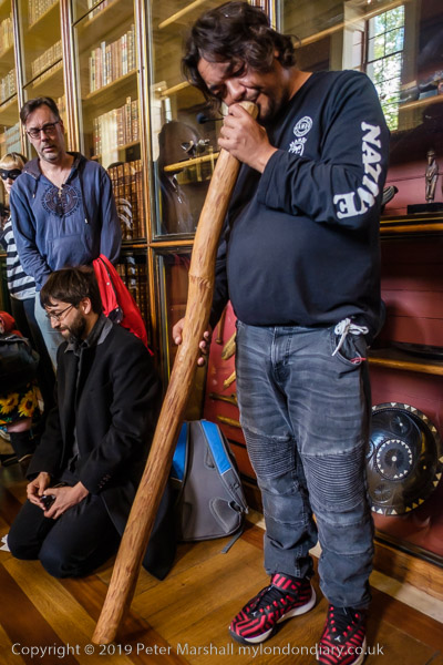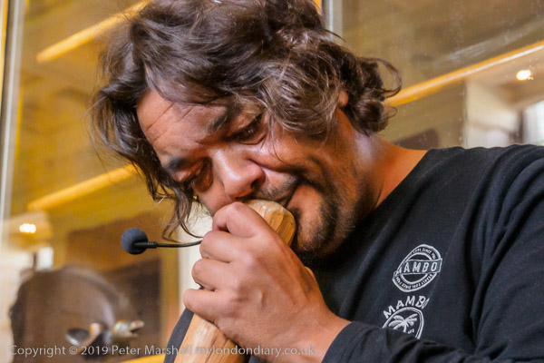 Rodney Kelly plays a long note on his didgeridoo (also known by many