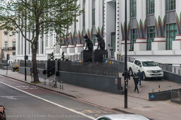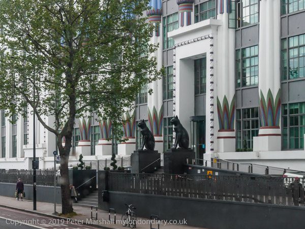 black cats guarding the entrance, one of London's best Art Deco buildings.
