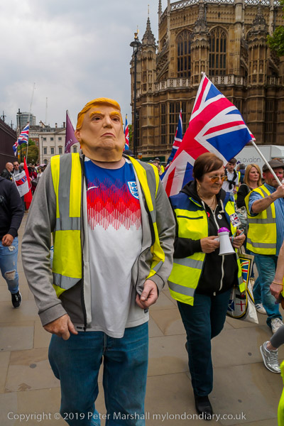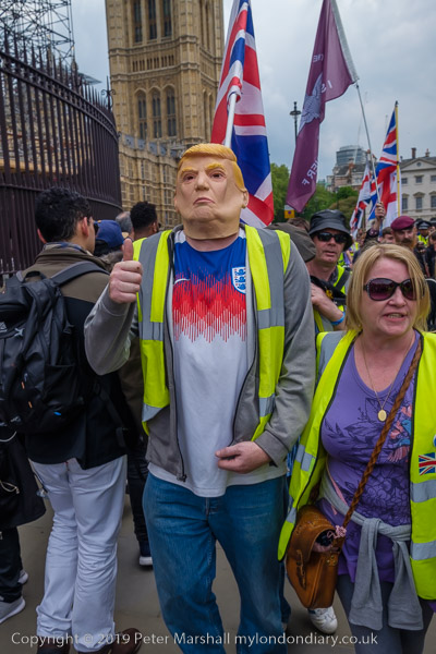 One man wore a rubber Trump face on his head