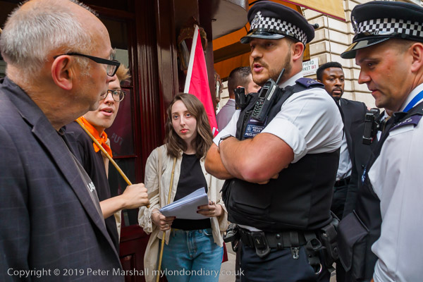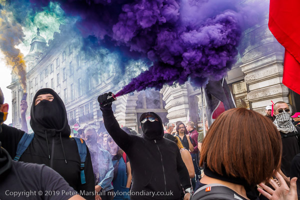 The London Anti-Fascist Assembly and other groups opposing the extreme right met at Oxford Circus and marched up Regent St towards the BBC where a small group of Robinson supporters had gathered. Police marched with the anti-fascists and a line of officers stopped them a few yards from the Free Tommy protest as they attempted to approach, and after some shouting at the protesters they were pushed by police to a pen on the opposite side of the road.
