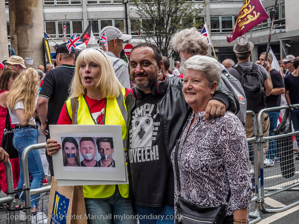 After a short while, Antifa were joined by Stand Up to Racism protesters who had met elsewhere and were led by the police to the same area. The small group of 'Free Tommy' protesters who had been at the BBC were later joined by another small group who had marched with a police escort from Trafalgar Square.