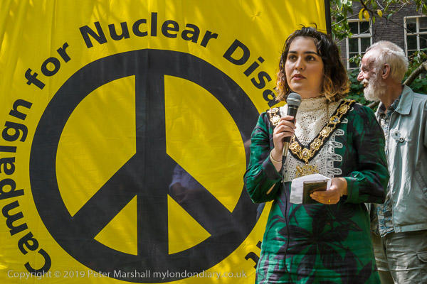 London CND hold a ceremony 74 years after the dropping of the atomic bomb on Hiroshima in memory of the victims, past and present also remembering those killed and living with the effects of radiation by the second atomic bomb dropped on Nagasaki three days later.
