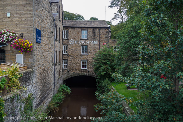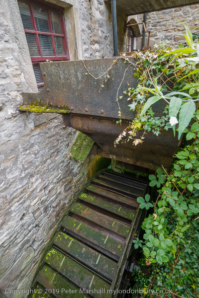 The back of the High Corn Mill. The wheel is hidden by the trees at