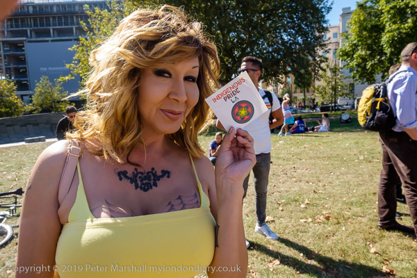 A visitor from Los Angeles with a 'Indigenous Pride L A' card