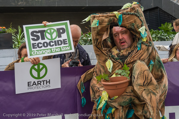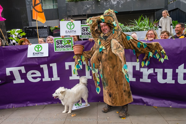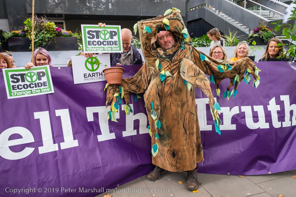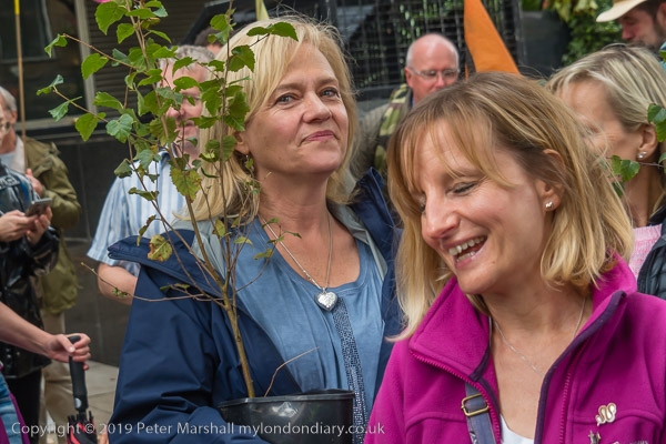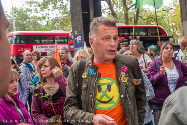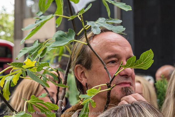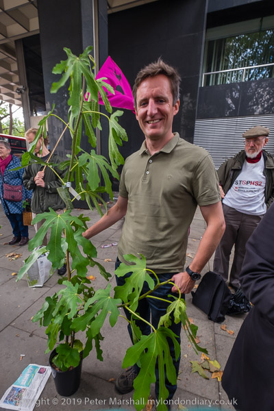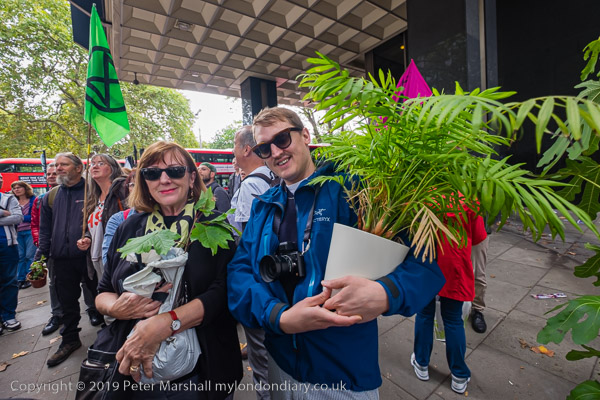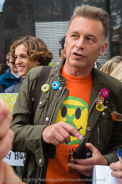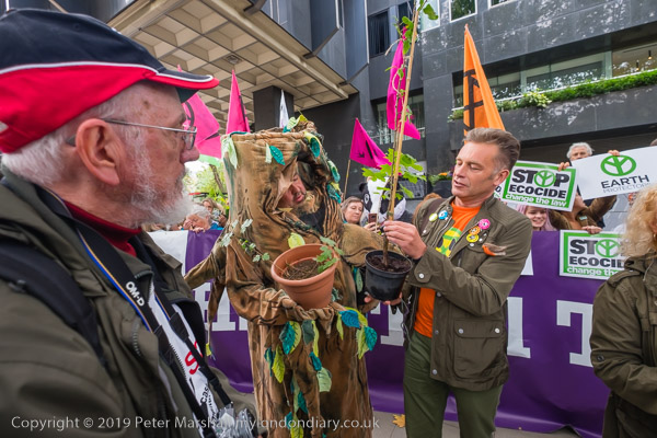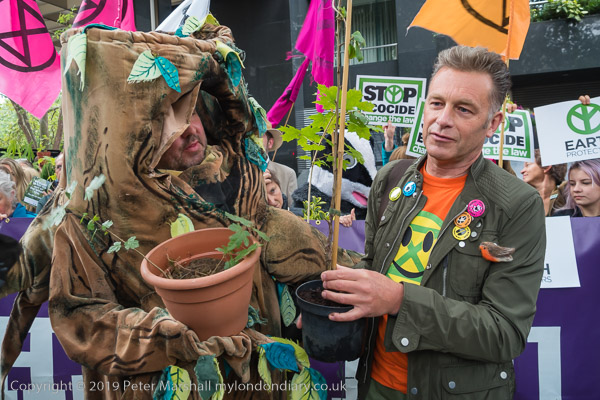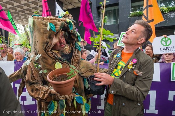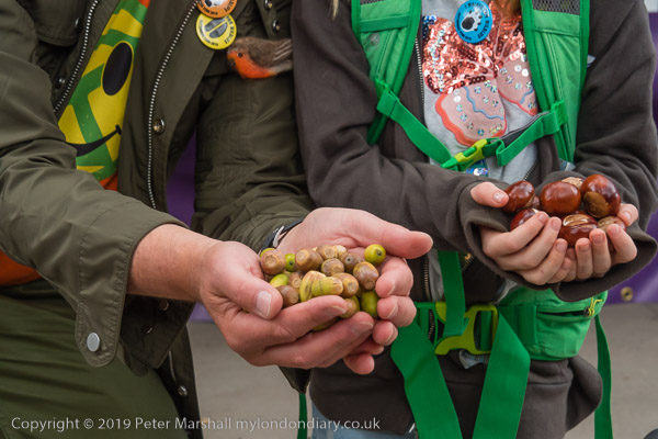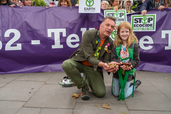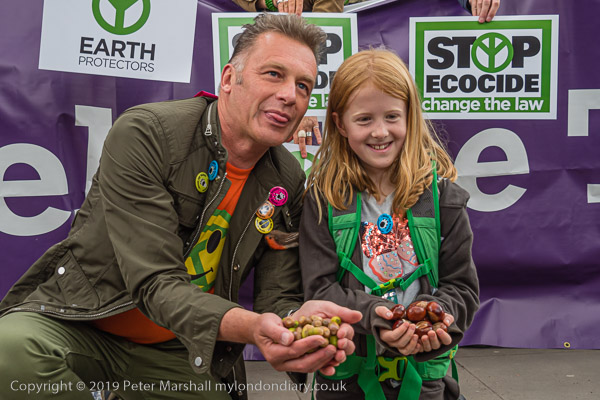 Chris Packham and a young protester with handfuls of acorns and conkers