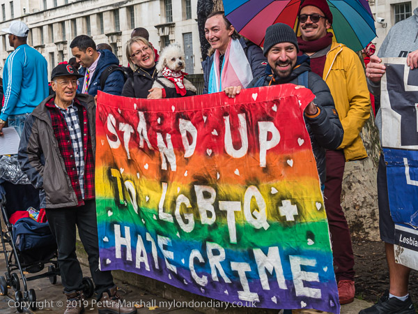 and a dog hold the Stand Up To LGBTQ+ Hate Crime banner at Downing StA rally at Downing St by Stand Up to Lgbtq+ Hate Crime condemned the increasing incidence of hate crime and bigotry against LGBTQ+ people and defended the teaching of lessons which feature LGBTQ+ families and relationships.