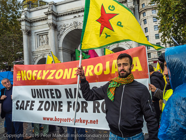 Kurd holds a YPG flag and poses in front of a banner and Marble ArchPeople met at Marble Arch for a rally and march in support of Rojava in North-East Syria against Turkish invasion.