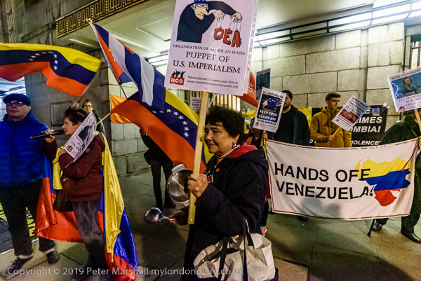 The protesters say the OAS (in Spanish the Organización de los Estados Americanos, OEA) is a "puppet of US imperialism" and turns a blind eye to human rights violations by the US and Latin American right-wing regimes, but supports attacks on socialist countries that stand up to the US, such as the attempted coup against president Maduro in Venezuela where US sanctions and blockade are said to have resulted in 40,000 deaths.