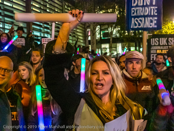 A large crowd in front of the Home Office waved glow sticks and called for Julian Assange to be freed and not to be extradited to the USA where he faces life imprisonment.