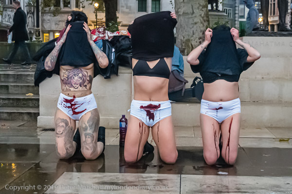 The march halted at Parliament Square where a group of women dressed in black performed in protest against the sexual abuses, smearing fake blood on pairs of white pants which they then removed and held above their heads.