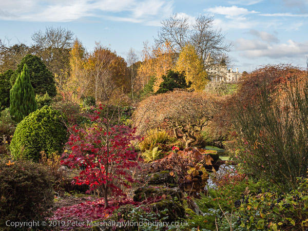 The gardens were created to the designs of landscape architect Edward White and adjoin the historic Stoke Park, now a golf course but at one time owned by Elizabeth I and later the Penn family, and landscaped by Capability Brown and Humphry Repton. The extensive gardens are now maintained by South Bucks District Council with volunteers helping the five staff. Many leaves had fallen but there was still some remarkable colour on the trees.