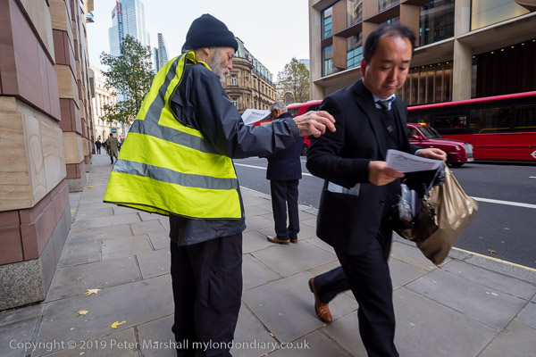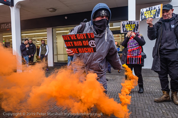 The small group of anarchists who had come on the protest also wanted to get rid of Johnson but had a different scenario in mind. As one of their posters read: 'Why Vote? Revolt! Chile Haiti Iraq France Lebanon Hong Kong Barcelona Athens Berlin Why Not Here!??' Uxbridge seems to me an unlikely place to start the revolution, though Class War had intended to field a candidate in the election, but for various reasons they left it to Lord Buckethead and al.