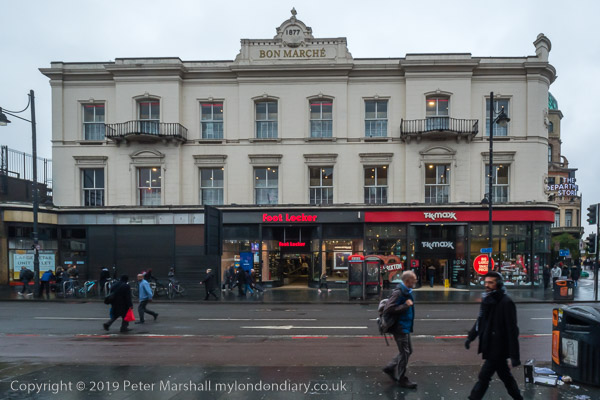 Bon Marché, immediately north of the railway on Brixton Rd has a fascinating history which you can read about on Brixton Buzz. Built as it says in 1877, it was based on the Paris department store of the same name and was the first purpose built department store in Britain, and possibly the first steel framed building in the UK, some years before the Royal Insurance Building in Liverpool.