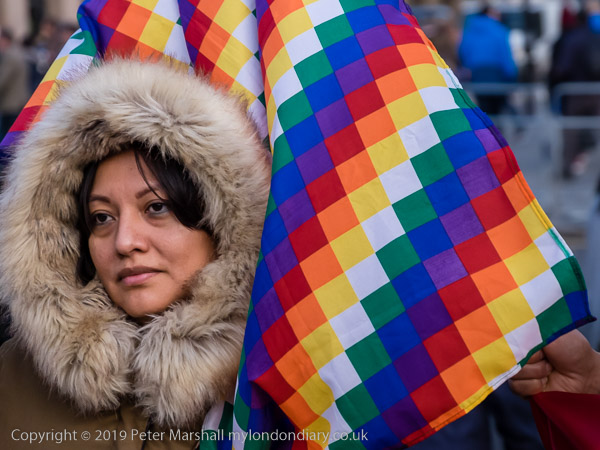 Protesters in Parliament Square denounce the right-wing coup against the democratically elected government of Evo Morales in Bolivia, supported by the US and backed by the UK and western media.