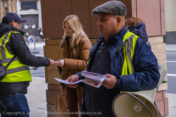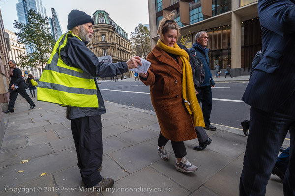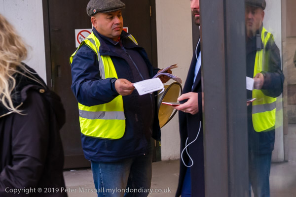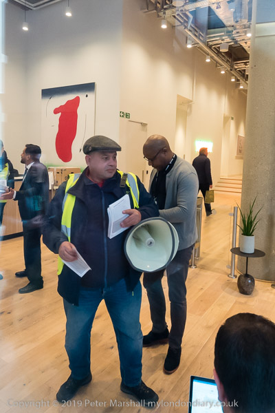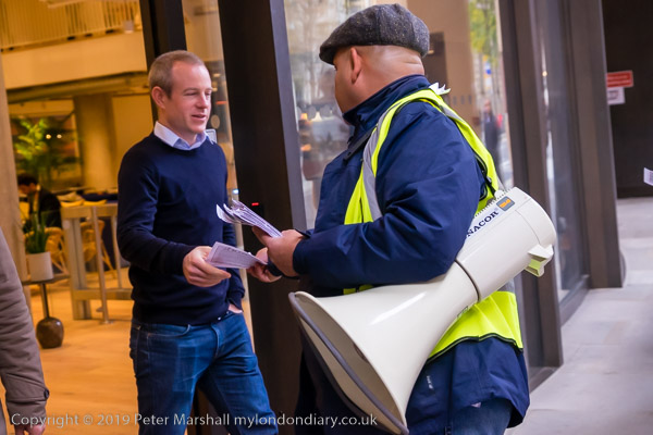 Alberto hands out fliers inside the WeWork offices with his megaphone