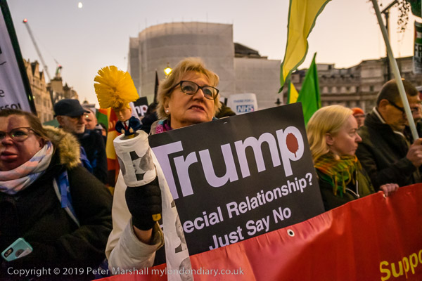 A large crowd listen to speeches in Trafalgar Square protesting against Trump's visit to the UK and NATO.