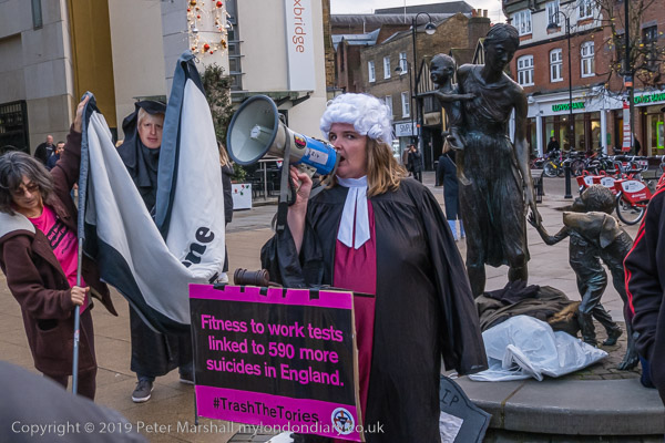 A street theatre trial by Disabled People Against Cuts (DPAC) in central Uxbridge called on voters to reject Boris Johnson and the Tories.