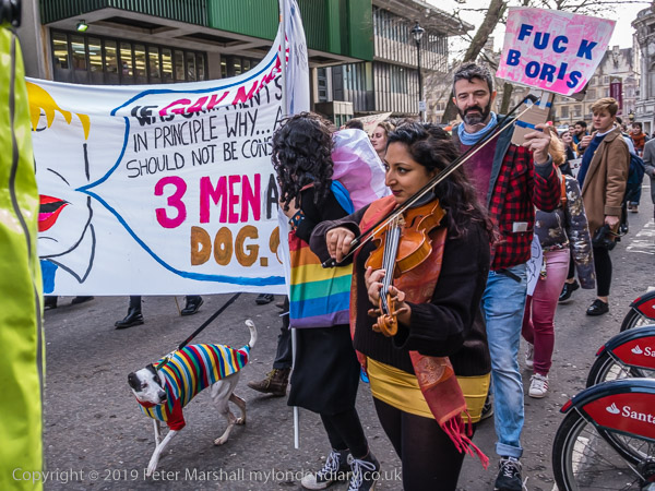 'Bum Boys Against Boris', taking their name from a homophobic speech by Boris Johnson, held a wedding between three men and a dog outside Tory HQ before marching to protest at Downing St.