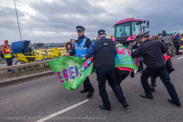 Extinction Rebellion brought the bulldozer, but Boris didn't turn up. Police stopped the protesters going to the Heathrow roundabout where there is a large plane advertising and airline and instead the protest blocked one lane of the A4 above the access road to the airport. Police prevented them from blocking the whole west-bound carriageway and the lie-in took place with traffic moving past the lie-in on the outside lane.