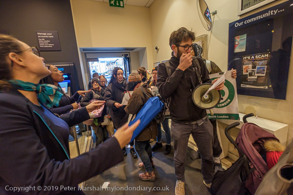 They handed out fliers and spoke on the corner of Brixton Road and Coldharbour Lane before marching along the Brixton Road to protest at some of the shops which are most involved in the climate crisis. They went inside Barclays Bank who are still investing heavily in fossil fuels and are major backers of fracking in the UK and then moved on to protest outside a number of shops on Brixton Rd, one of the busiest shopping streets in the capital.