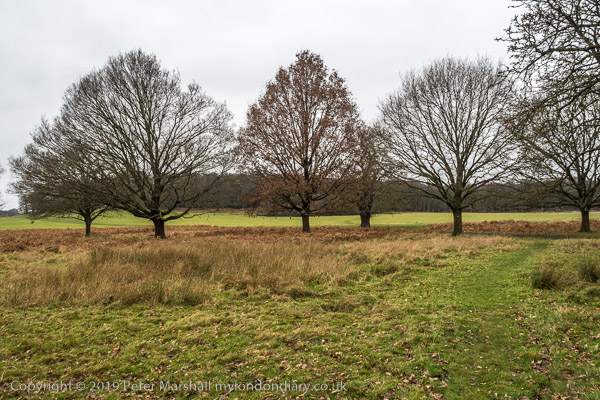So we got the train and met them at Wimbledon station. It was good weather for a walk, though rather dull, and it kept dry, though some of the paths were very wet and muddy from the heavy rain which we had so much of earlier in the month. We walked up the hill from the station to Wimbledon Common and then walked roughly west through along mainly wooded paths to Beverley Brook and then across the Kingston bypass and into Richmond Park.