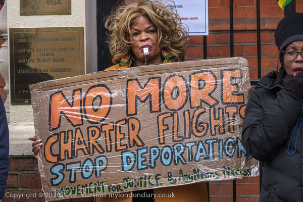 Movement for Justice lead a protest outside the Jamaican High Commission demanding Jamaica end accepting Britain's racist deportation flights.