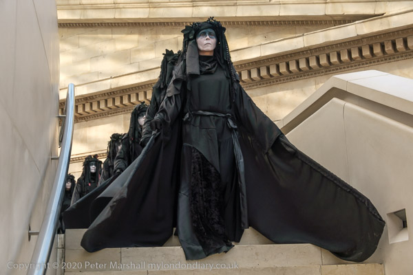 BP are sponsoring the current Troy exhibition and protesters say BP arts and culture as a Trojan Horse to hide its deadly activities. They brought a Trojan Horse to the museum courtyard and some protesters dressed as Greek Gods and ancient Greeks. The XR mime group usually referred to as the 'Red Brigade' were in black for the event, the colour of 'black gold' crude oil.