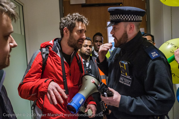 A small group of police were already guarding the entrance, and more arrived shortly. For the next couple of hours this and the Paternoster Square entrance to the Stock Exchange were closed down with a thin line of police facing the protesters. The police grabbed one young woman and held her on the ground behind their line, roughly manhandling her for some minutes. Her comrades made one determined effort to break through the line and free her but were repulsed, and a long stand-off followed with police unable to take her through either entrance to a waiting van.