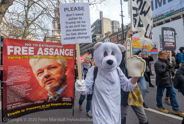 People met at Australia House to march to a rally in Parliament Square calling for the release of Julian Assange whose extradition trial begins on Monday.