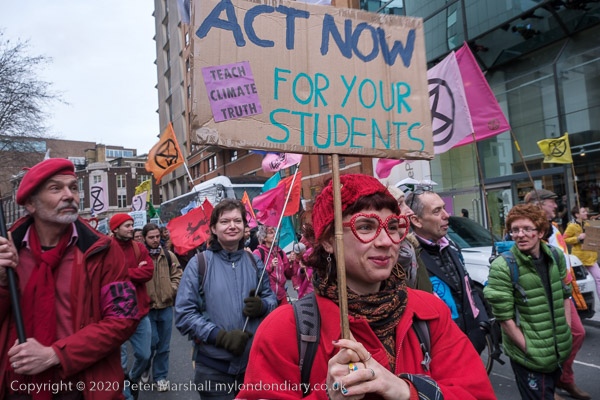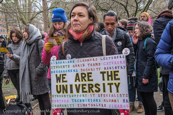 UCU members at the end of a 5 day strike marched from a rally outside the offices of university management UCEA/UUK to the City of London and the offices of the USS pension scheme.