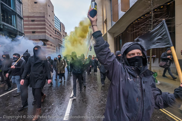 smoke on the march through the centre of the cityGreen Anticapitalists protest in the City of London against the wilful destruction of the Earth's ecosystems by the capitalist system.