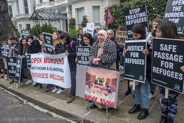 Protesters opposite the Greek Embassy called on the EU to end its policy of closing borders to those most in need and to demand justice for refugees.