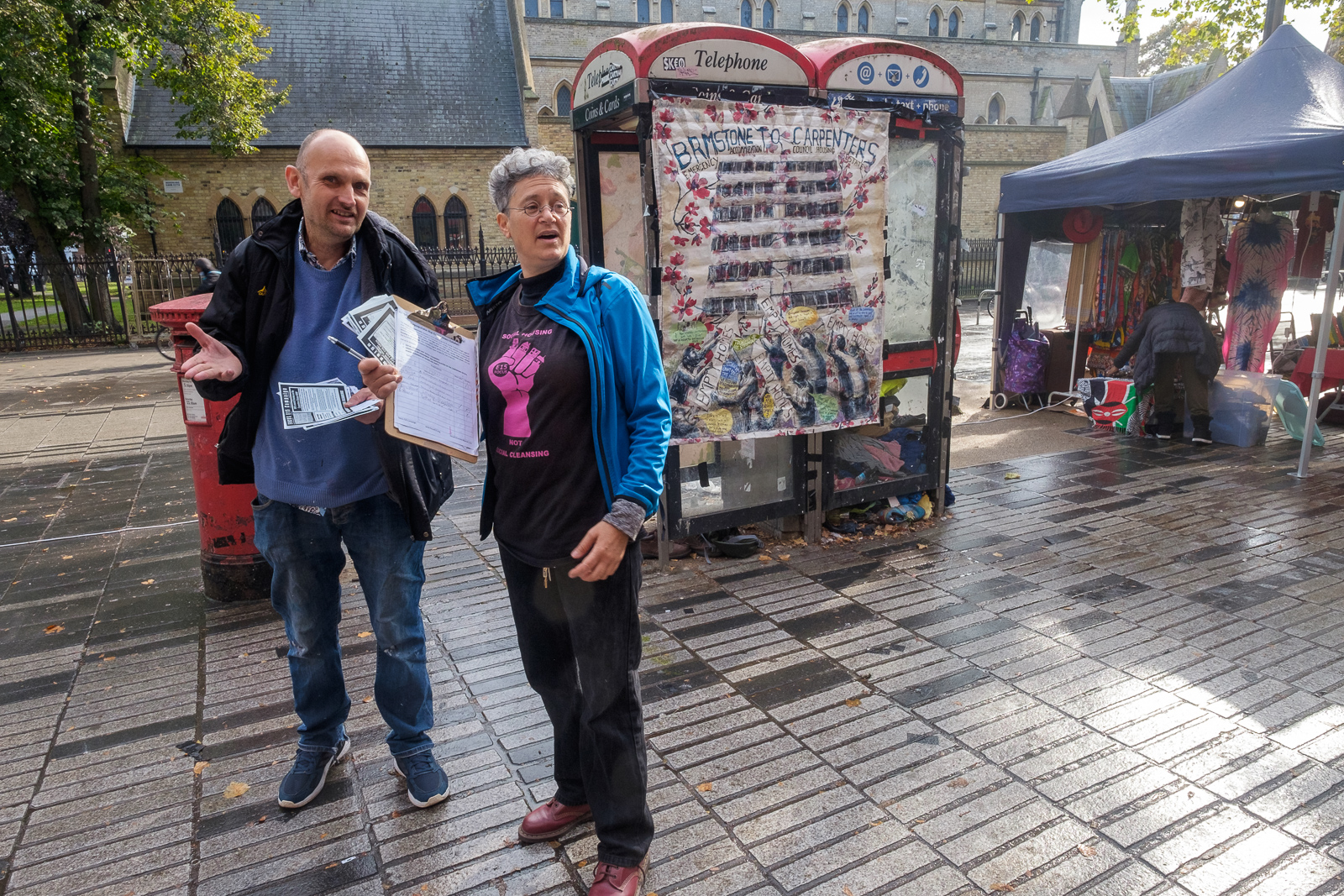 London, UK. 16th Oct 2021. Housing activists Focus E15 held their regular street stall on Saturday lunchtime in Stratford Broadway, offering advice and support to anyone with housing problems. The group began when residents in a hostel for young single mothers were threatened with eviction and dispersal across the country by Newham Council in 2013 and now fights for decent homes for all in Newham, to stop evictions and social cleansing.