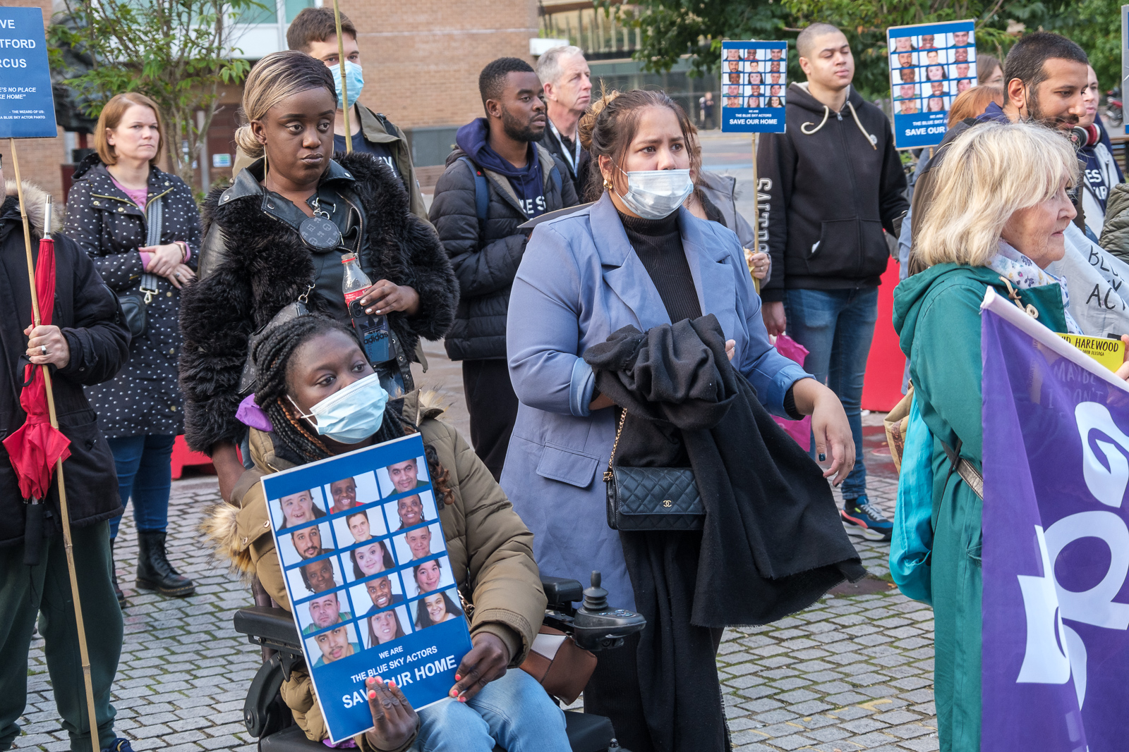 London, protest, march, Stratford, Theatre Square, Stratford Circus, Equity, N & E London, Arts zone, professional arts, cultural hub, adult community arts, cultural activity, Stratford Arts Trust, performing arts, theatrical tradition, Stratford Theatre, Joan Littlewood, Paul Fleming, Philip Hedley, Blue Sky Actors, Art Centre, Artistic director, Theatre Royal Stratford