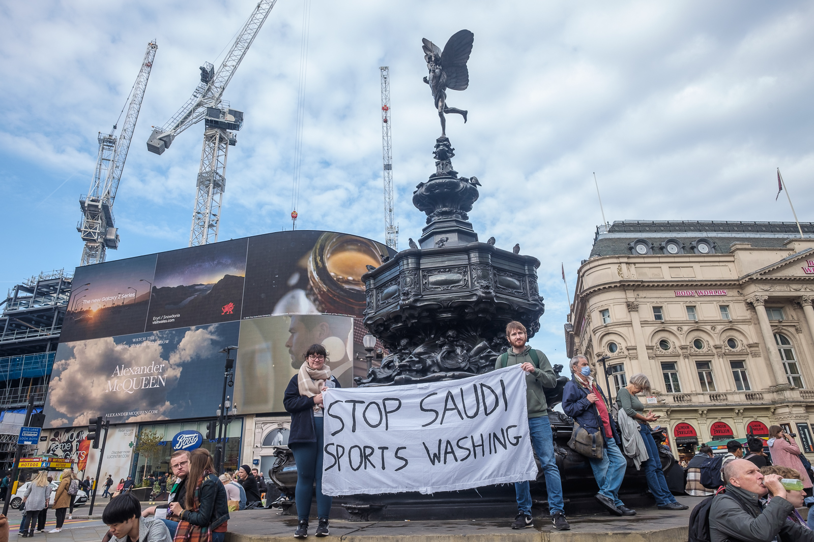 London, protest, Campaign Against Arms Trade, CAAT, sports-wash, sports-washing, human rights, repression, Yemen, Saudi-led attacks, journalists, women’s rights, activists, death penalty, thousands killed, bombing, schools, hospitals, atrocities, starvation, Saudi blockade,