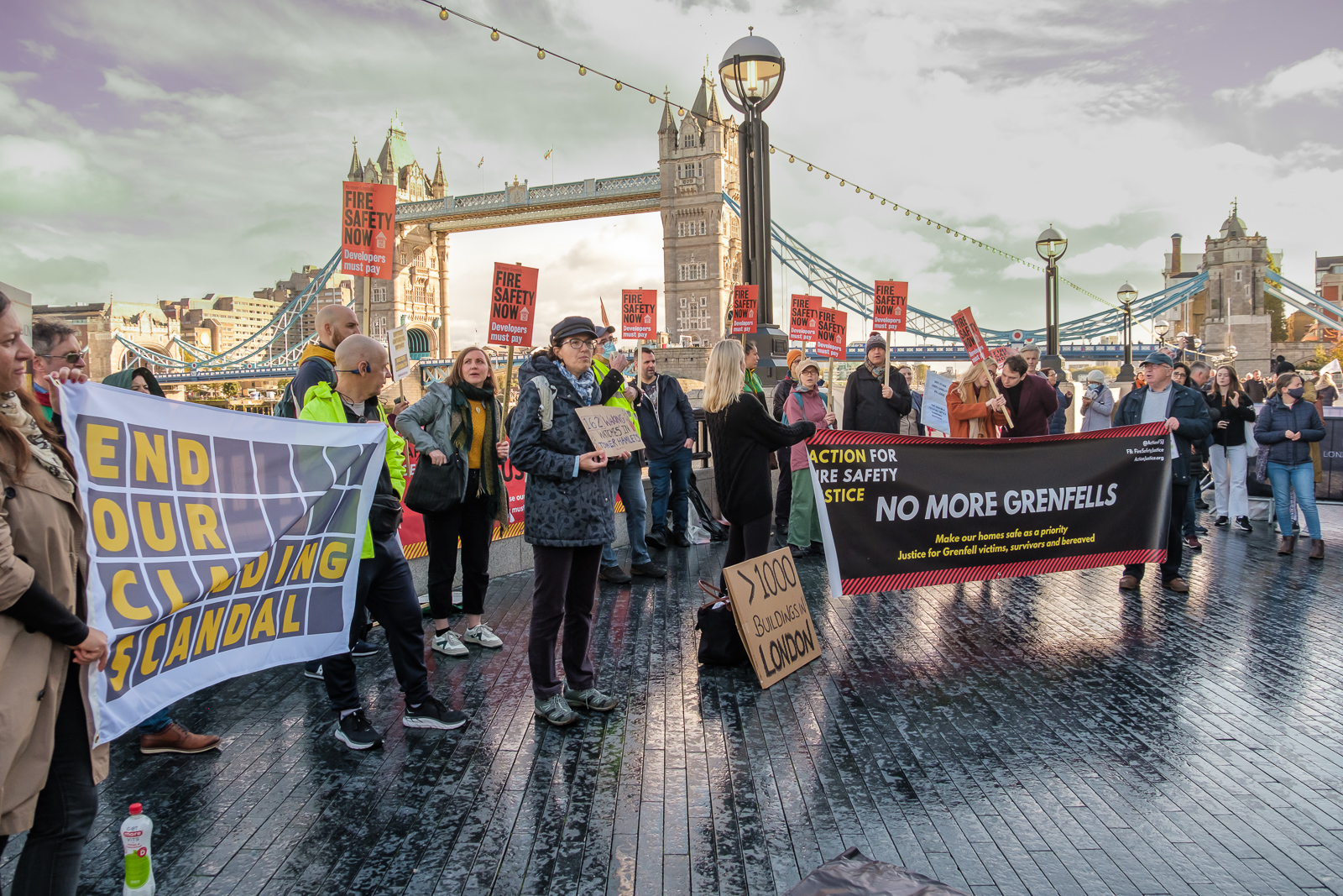 London, UK, protest, City Hall, GLA, London Assembly, London Mayor, Sadiq Khan, fire safety, residential buildings, leaseholders, huge bills, bankruptcy, developers, Housing Associations, government failures, lack of regulation, building industry, building regulations, dangerous buildings, Grenfell, cladding, Polluter Pays Bill, waking watches, Tower Bridge,