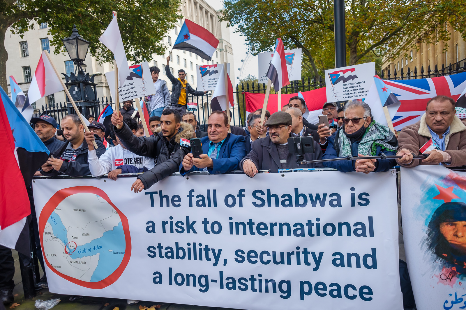 Protesters at Downing St wave South Yemen flags and call for support, saying that the fall of Shabwa is a risk to international stability, security and a long-lasting peace. They say the UN seems powerless and clueless about bringing about peace after 7 years of war.