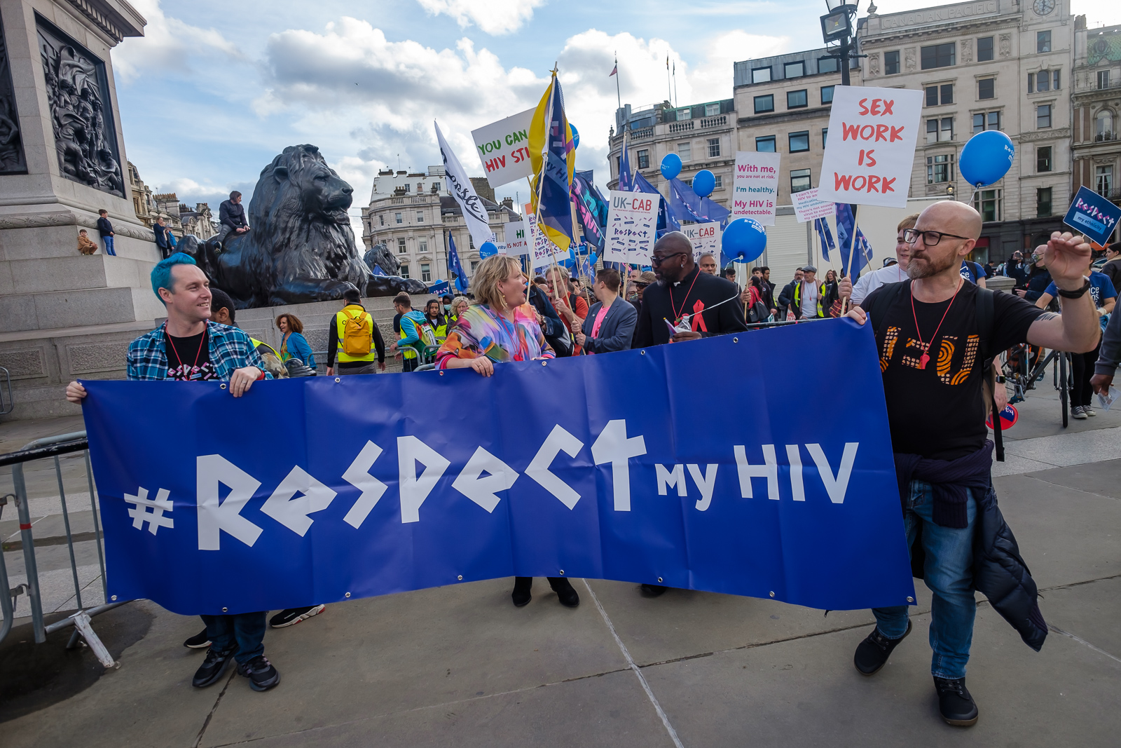 A community march to a rally in Trafalgar Square called for respect for the diverse range of people living with HIV. It celebrated advances in HIV care and on reducing HIV transmission and the stigma and discrimination against people living with HIV.
