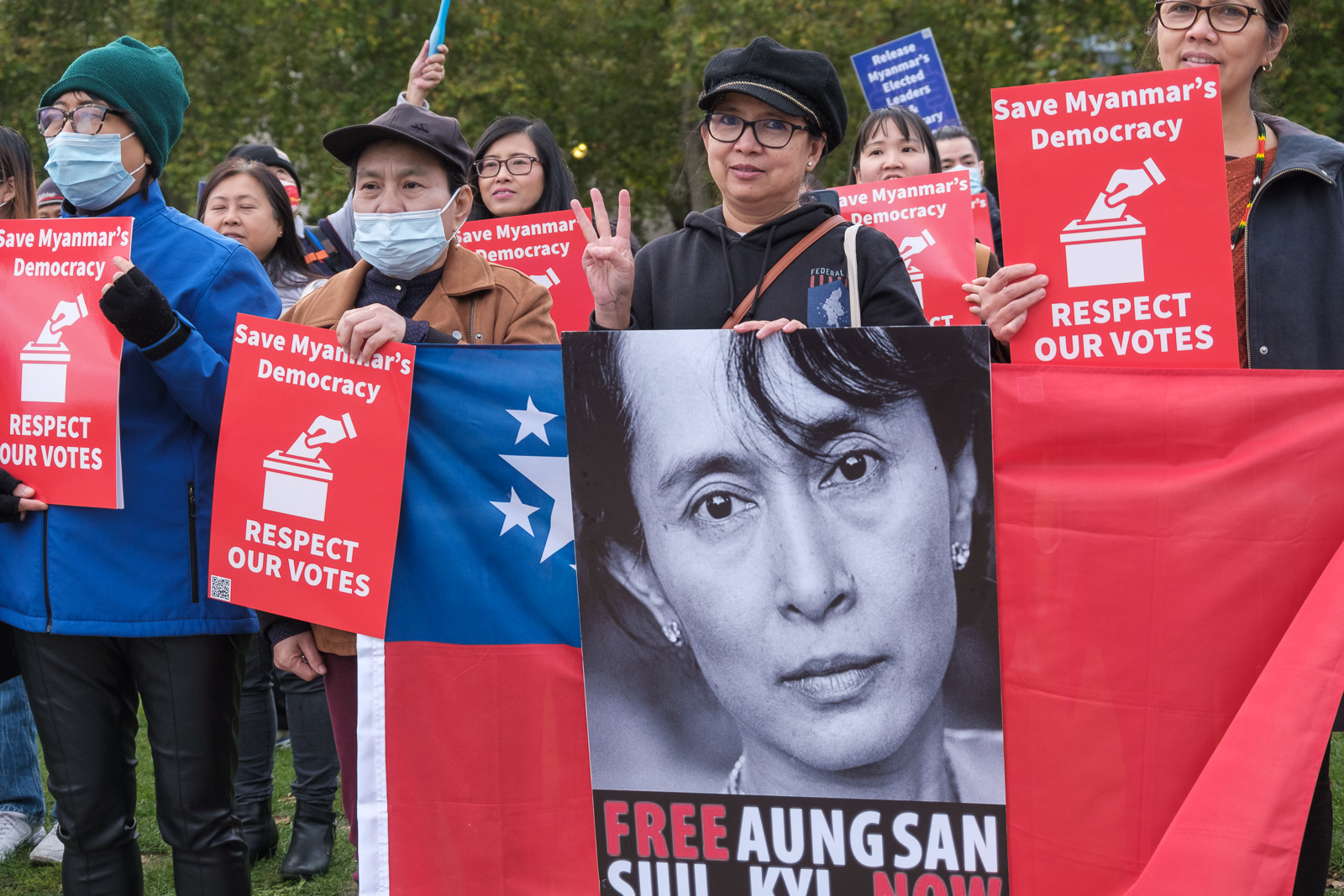 London, Parliament Square, protest, Myanmar, Burma, Burmese, military coup, military government, arrests, arbitrary arrest, coup, political leaders, democracy, detainees, spring revolution, Aung San Suu Kyi, release, political prisoners, elected leaders, Chin, military attacks, burning houses, refugees, burning churches, killing, artillery fire, national unity government, interim government, NUG, arbitrary detainees, march,