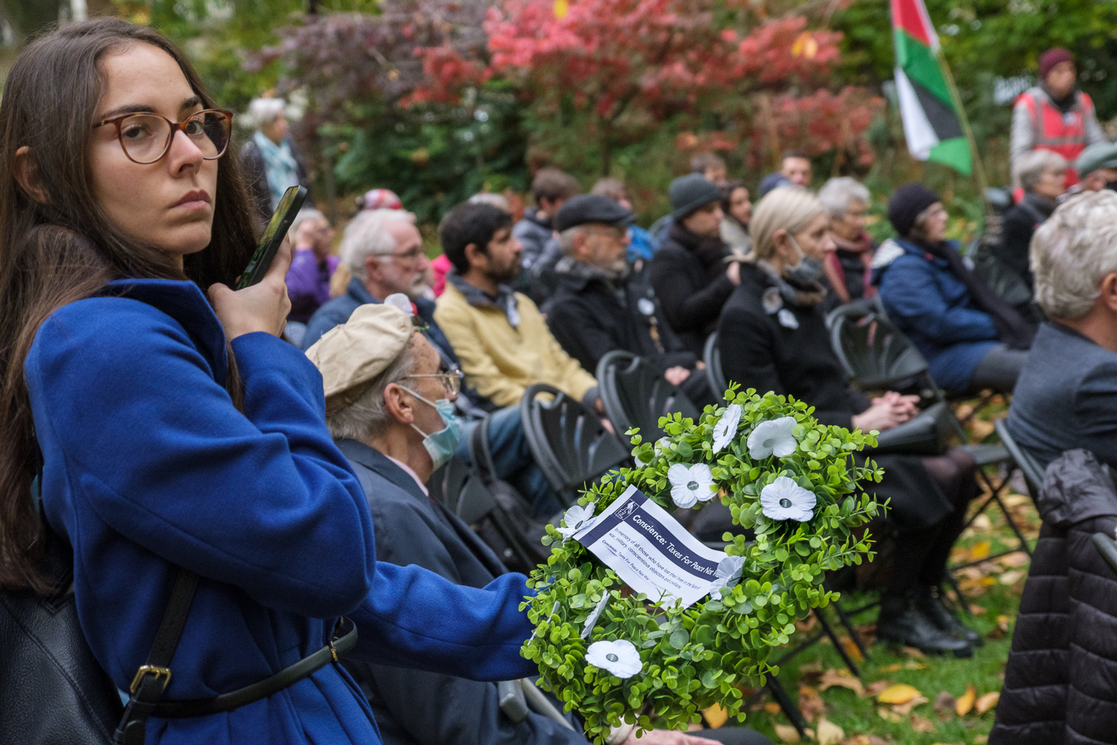 National Alternative Remembrance Ceremony, Tavistock Square, remembrance, injustices of war, war victims, victims or war, military, civilian, peace, white poppies, national ceremony, PPU, Peace Pledge Union, Conscientious Objectors' Commemorative Stone, Conscientious Objectors, memorial stone, wreaths, Anya Nanning Ramamurthy, youth climate strikes, London, Hamit Dardagan, Iraq Body Count, Every Casualty Worldwide, Huda Ammori, activist, Palestine Action, remembrance day, remembrance Sunday, silence, two minute silence,