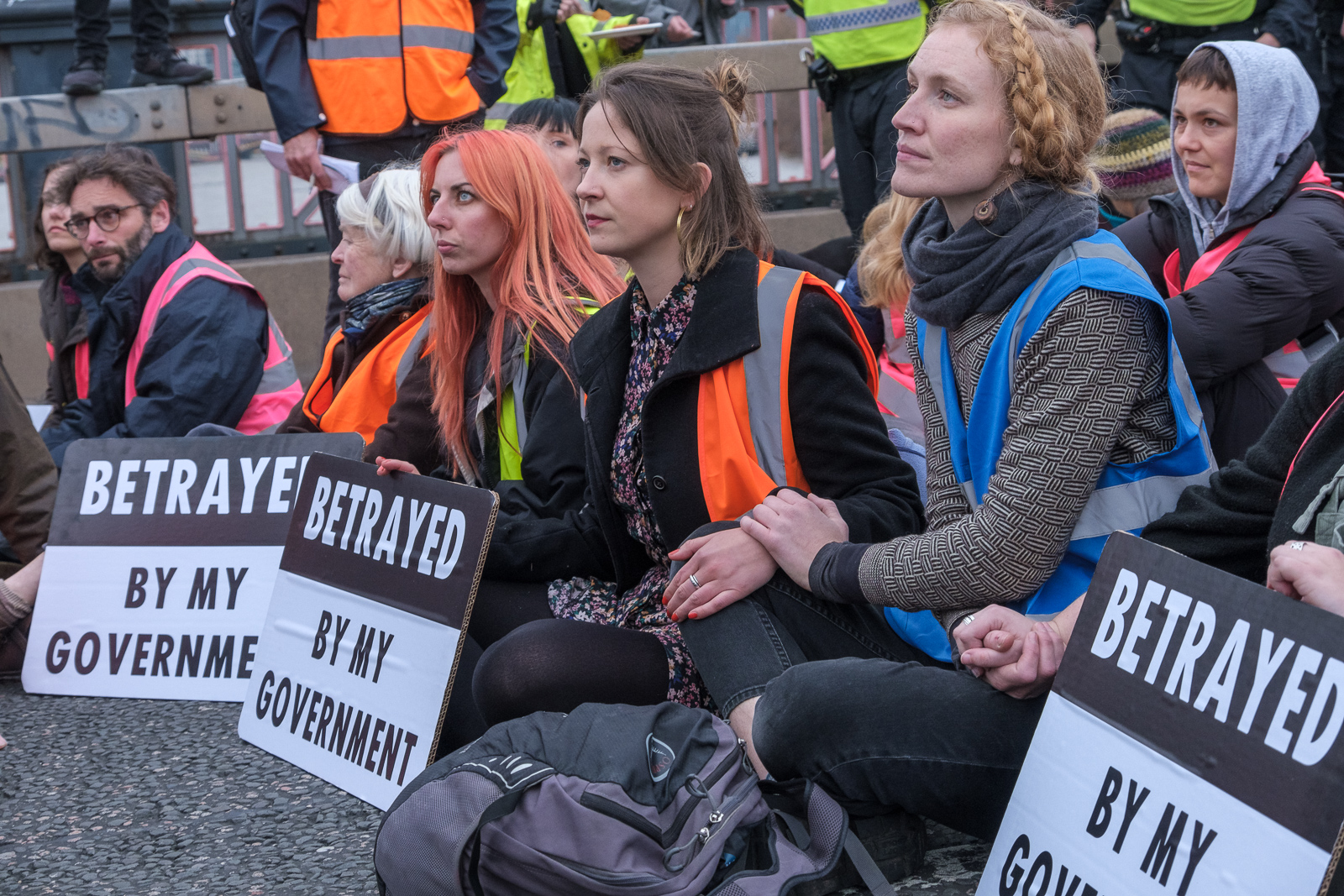 Protesters met at the Royal Courts of Justice and marched in solidarity with the 'Highway 9' peaceful protesters from Insulate Britain jailed for protesting on the roads who broke an injunction in an attempt to force the government to insulate homes as a vital contribution to combating climate change. They marched to Lambeth Bridge stopping at intervals for statements from the jailed protesters to be read, and then sat down blocking the bridge.